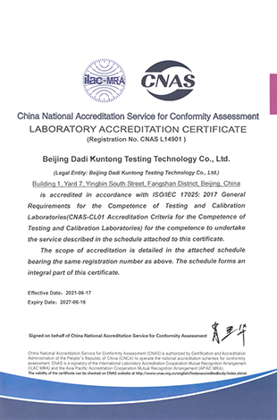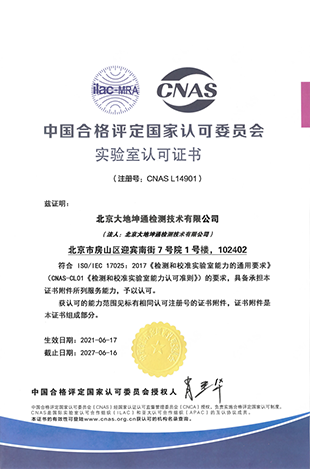 2021年6月22日,获得中国合格评定国家认可委员会颁发的CNAS实验室认可证书。